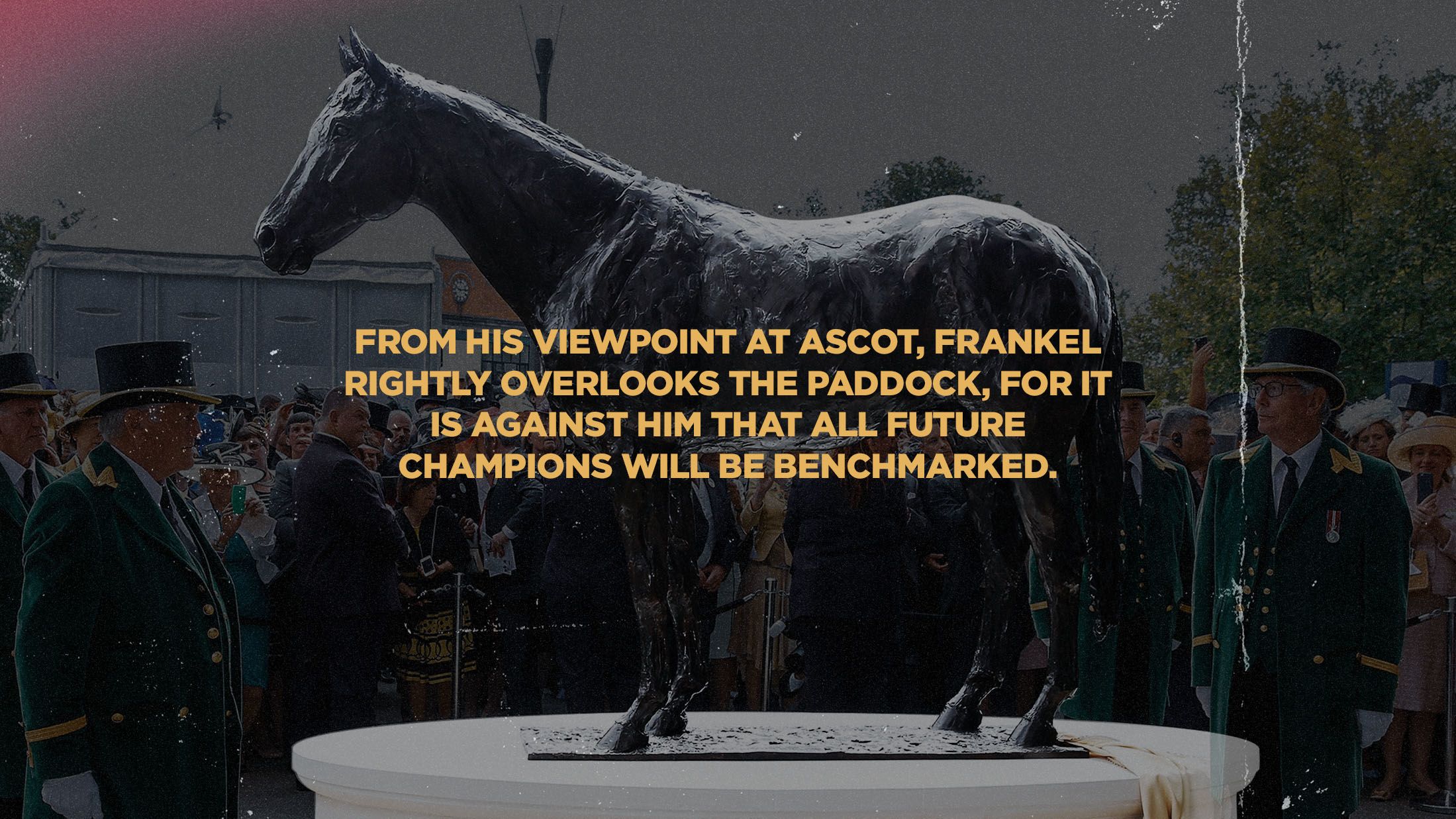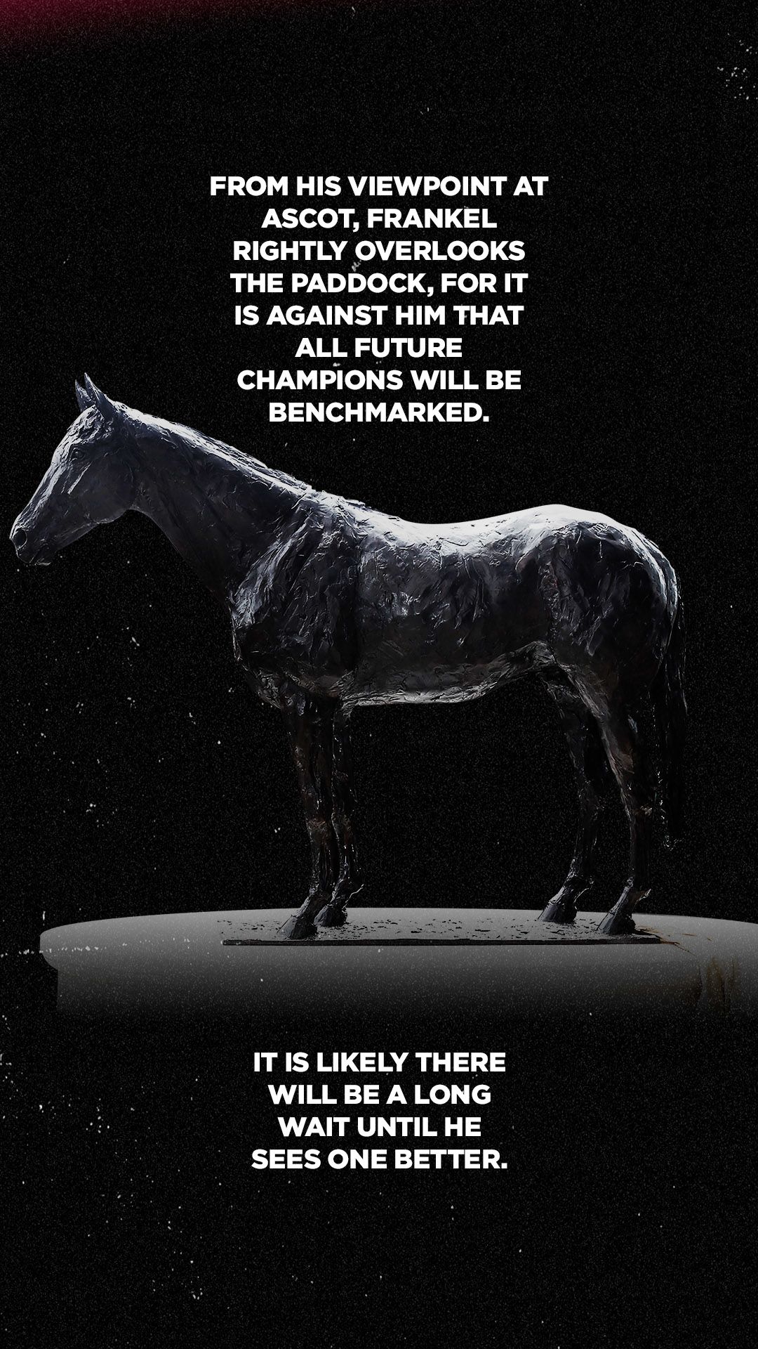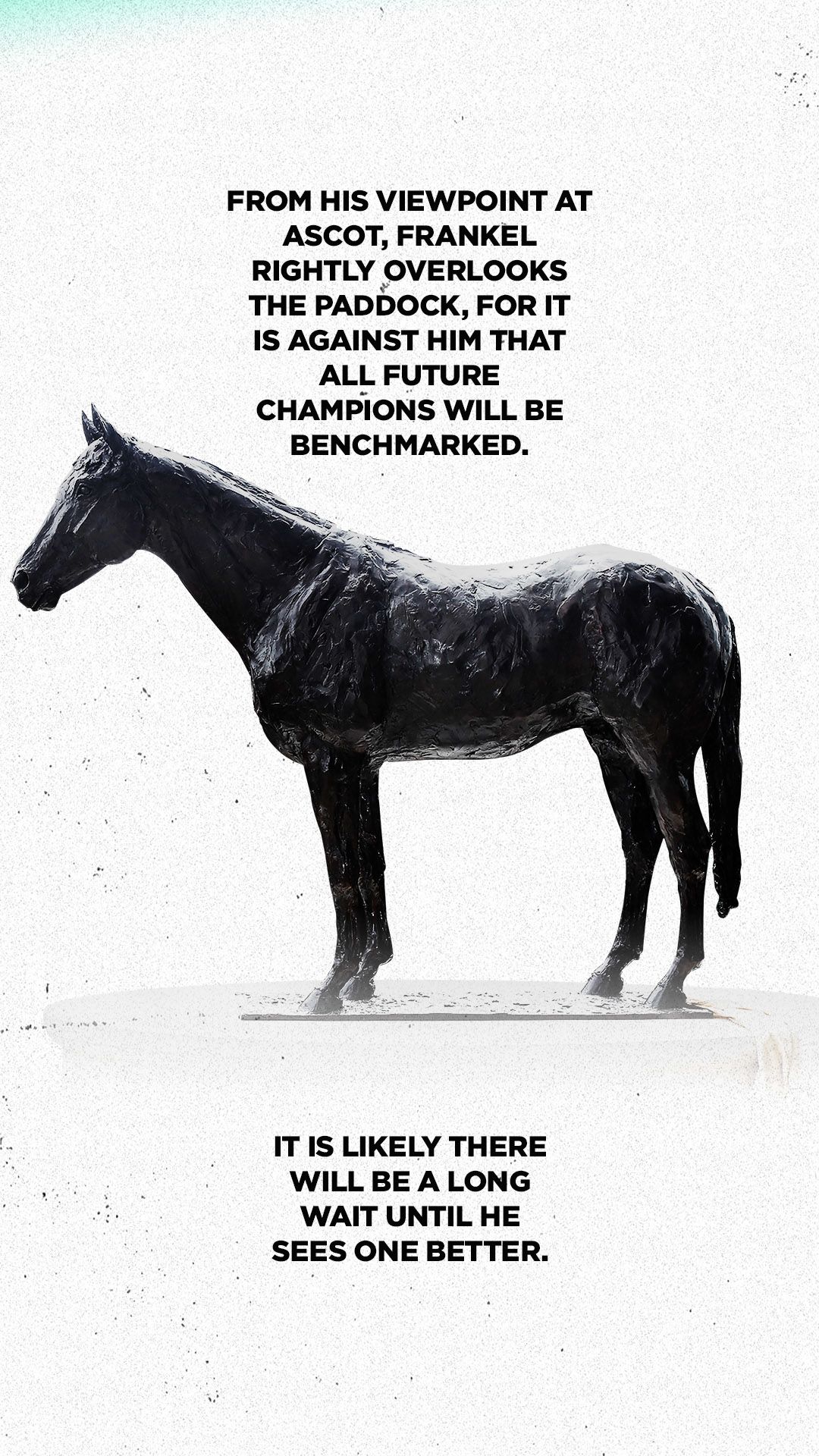 While he remains very much full of life at stud, Frankel is also immortalised in bronze, with life-size statues at the National Heritage Centre for Horseracing & Sporting Art in Newmarket, Banstead Manor, York racecourse and Ascot – home to five of his wins and also host of British Champions Day, the event which his presence ensured was an instant success.